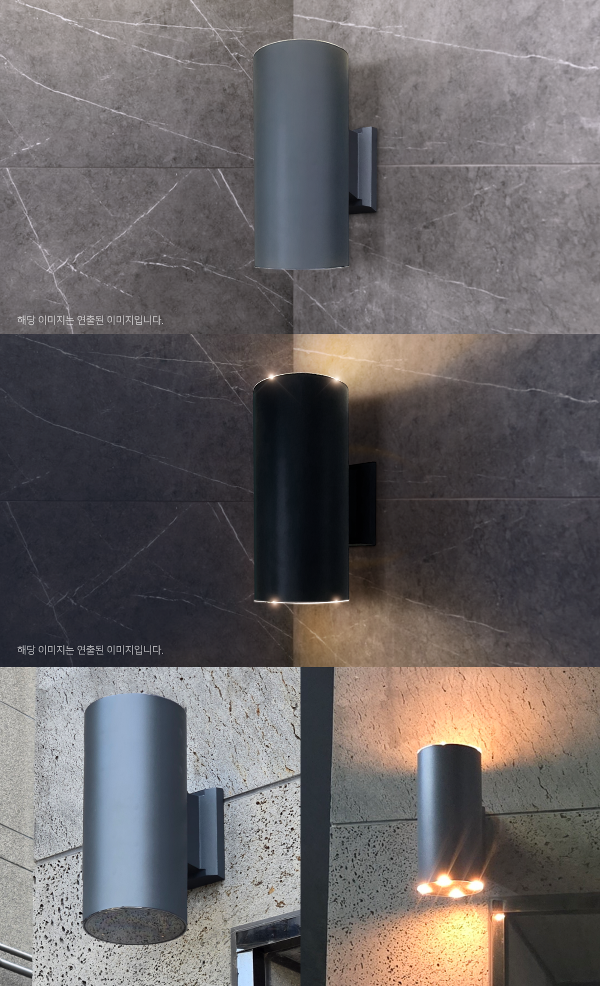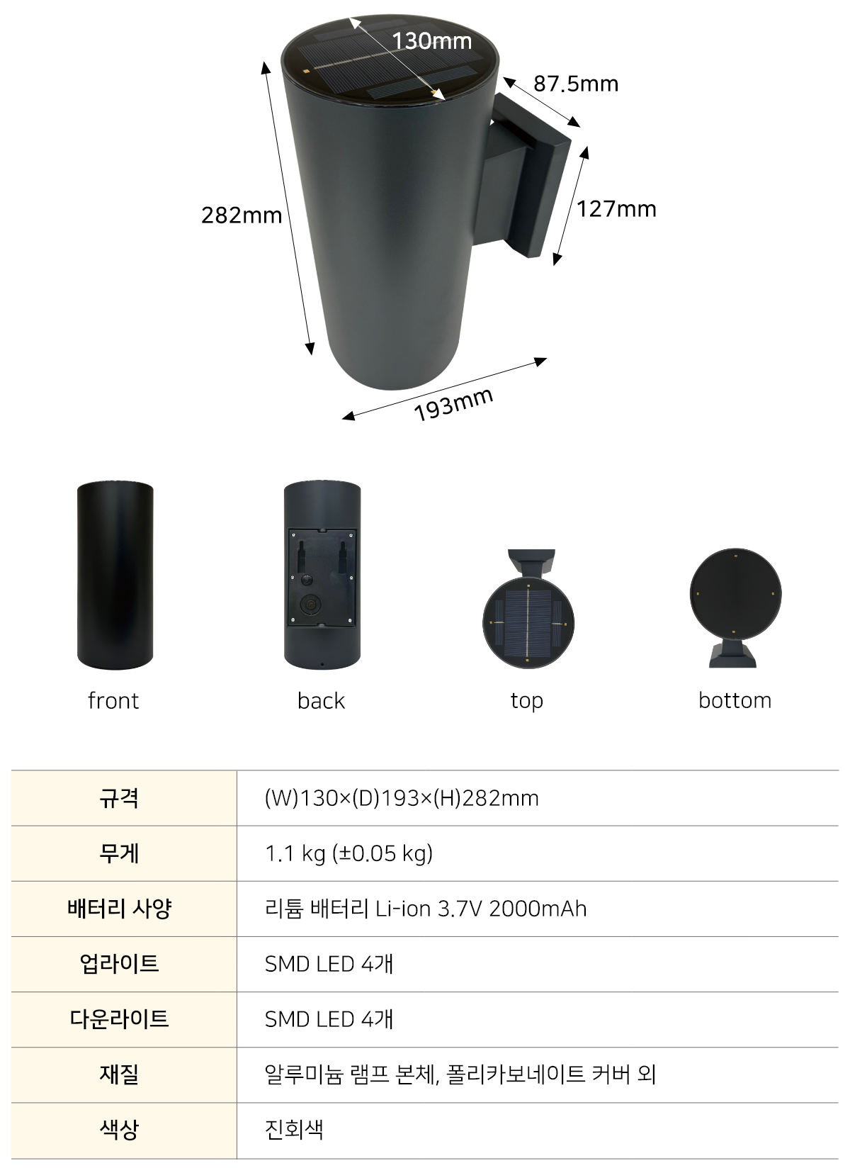 상부 태양광 패널을 통해 전원공급을 하는 야외용 원형 벽부등으로